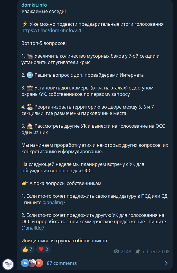 Также на скрине Telegram выше видно, что мы предложили собственникам порекомендовать УК от себя, а также проработать с этими УК коммерческое предложение. Задумка была такой: собрать КП от нескольких УК, провести внутренний конкурс и на ОСС вынести победителя.